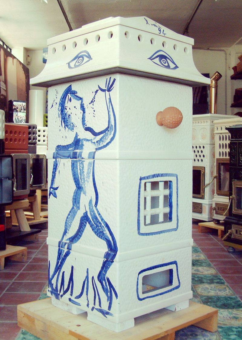 Stufa modello Vulcano decorata da Enrico Baj.