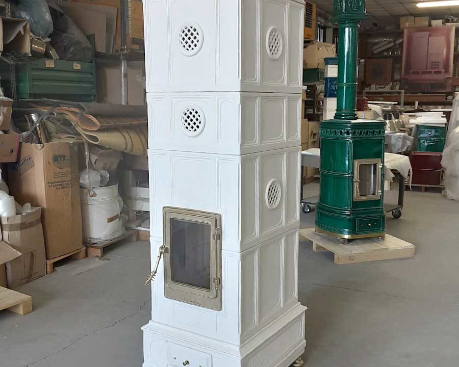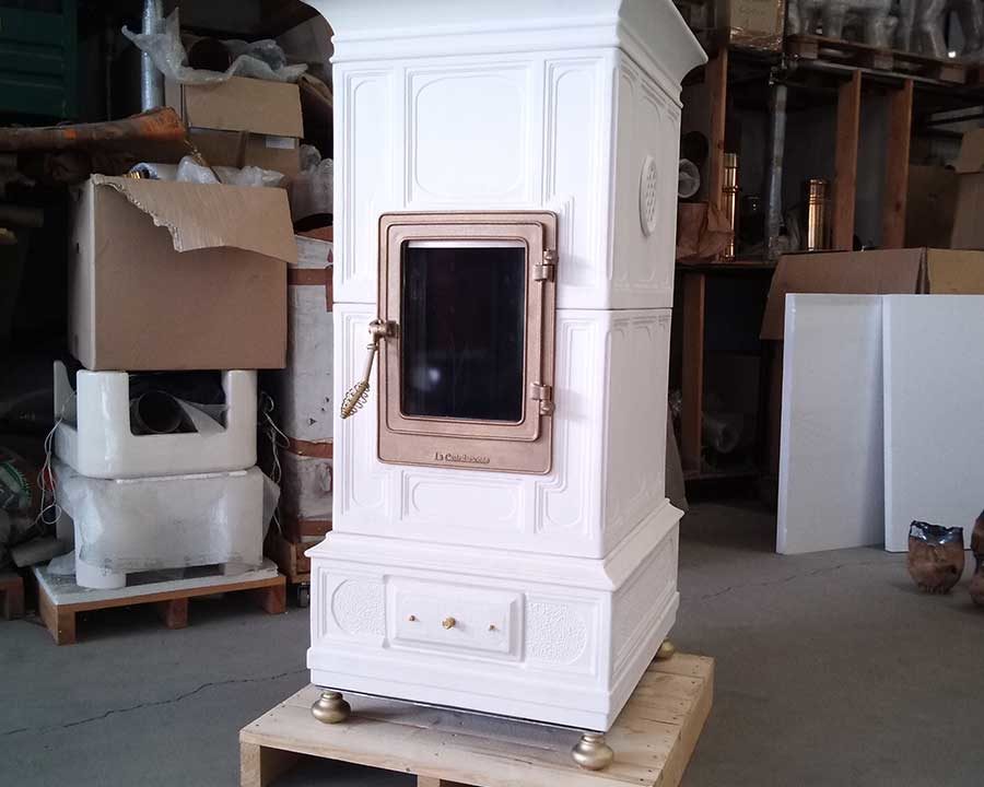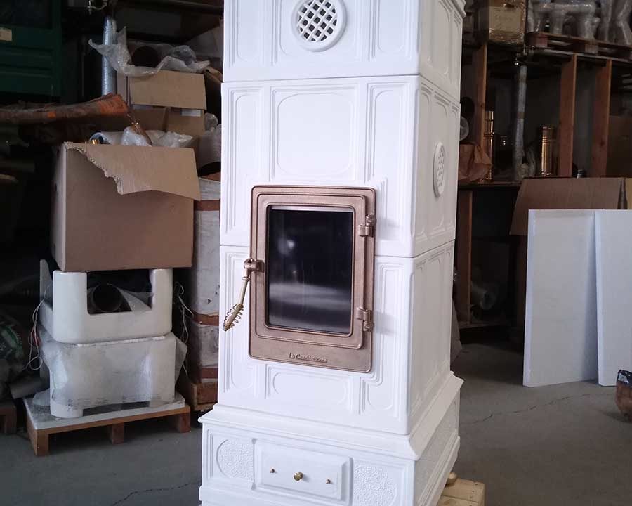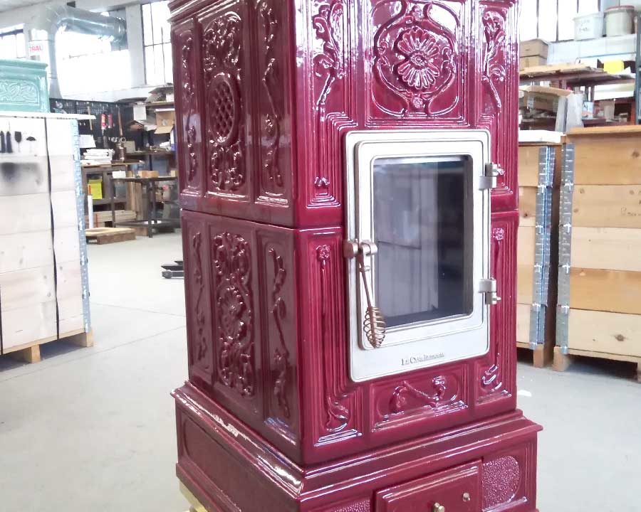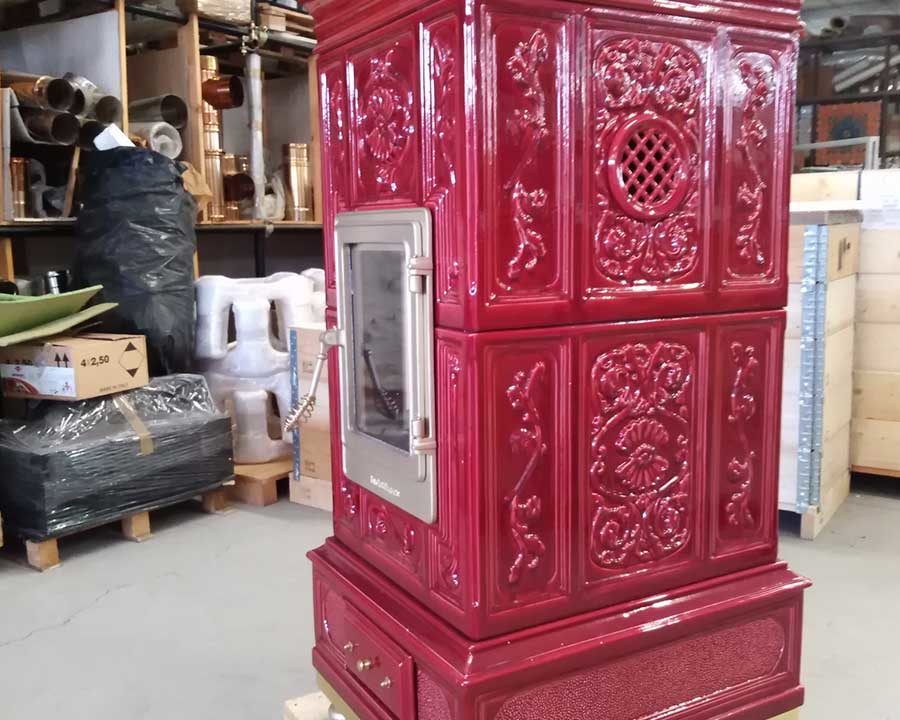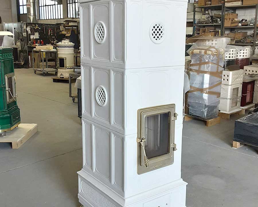 Disponibile quindi in 4 misure e nei soliti oltre 30 colori tra lucidi e opachi, New Vienna mantiene il titolo di ammiraglia della nostra produzione: una stufa classica ma lineare con le sue geometrie rigorose, con combustione a legna, può essere realizzata con un ricco ornato o con piastrella liscia.
